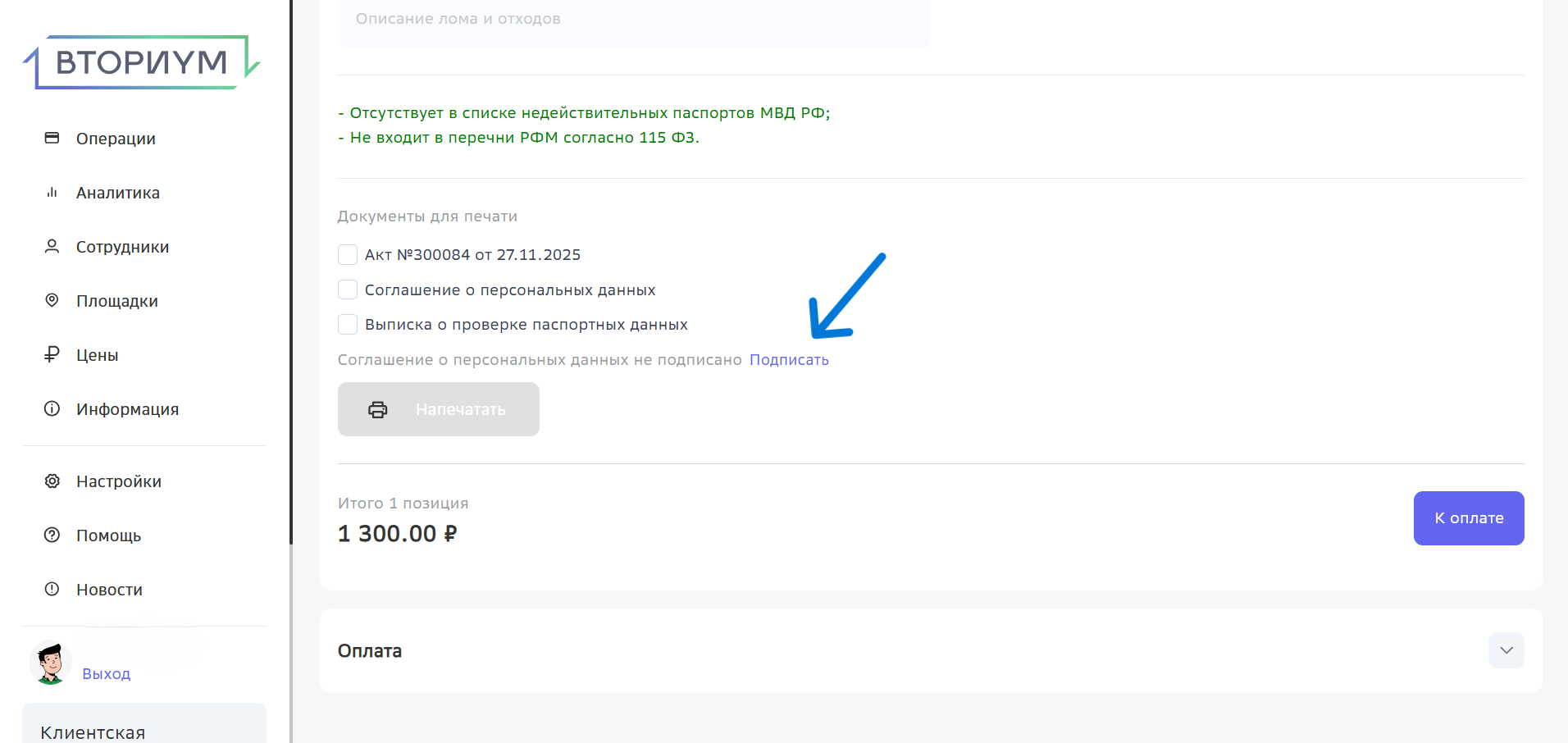 Процесс простой: после того, как соглашение распечатано и подписано, нажмите в системе кнопку «Подписать». Это зафиксирует факт подписания, и для последующих приемо-сдаточных актов с этим сдатчиком повторно оформлять согласие не потребуется. Так вы сокращаете бумажную работу и снижаете риск ошибок.