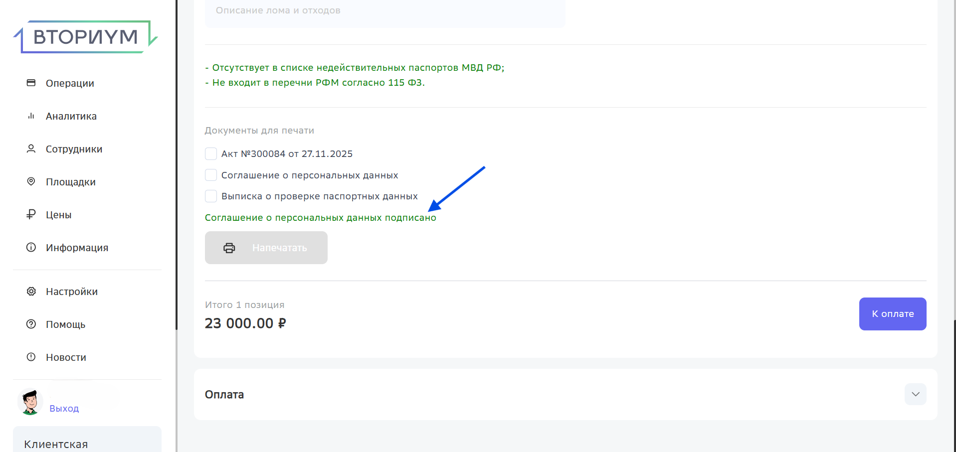 Автоматизация и упрощение рутинных процедур значительно ускоряют документооборот. Так, например, на платформе Вториум работает механизм отметки о том, что сдатчик подписал согласие на обработку персональных данных. Отметка о подписании этого соглашения экономит ваше время, исключает необходимость повторной печати и подписания при создании новых актов с тем же сдатчиком.