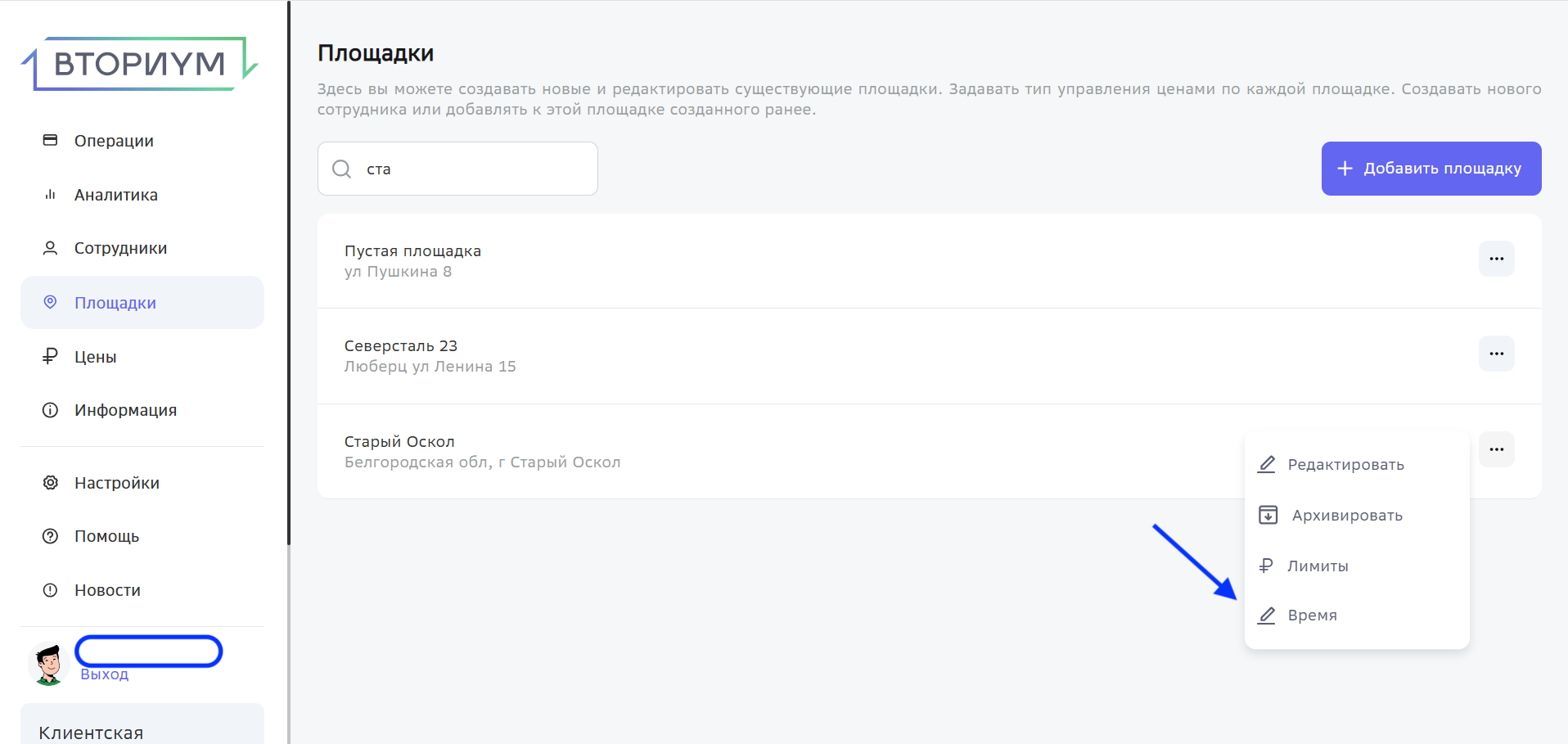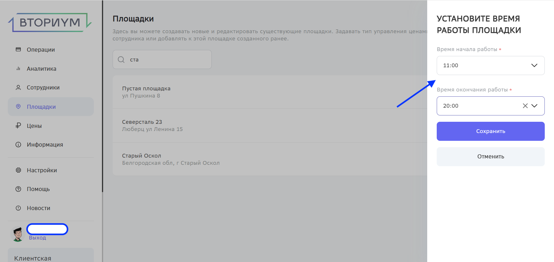 Для того, чтобы настроить эту опцию, сотрудник компании с ролью «Администратор» переходит в раздел «Площадки», выбирает нужную площадку и в её настройках во вкладке «Время» устанавливает рабочие часы, после чего сохраняет изменения.