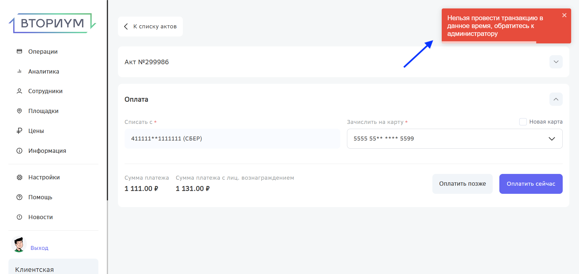 Теперь система позволяет проводить платежи только в установленное время, и если попытаться провести оплату вне этих рамок, операция будет заблокирована.