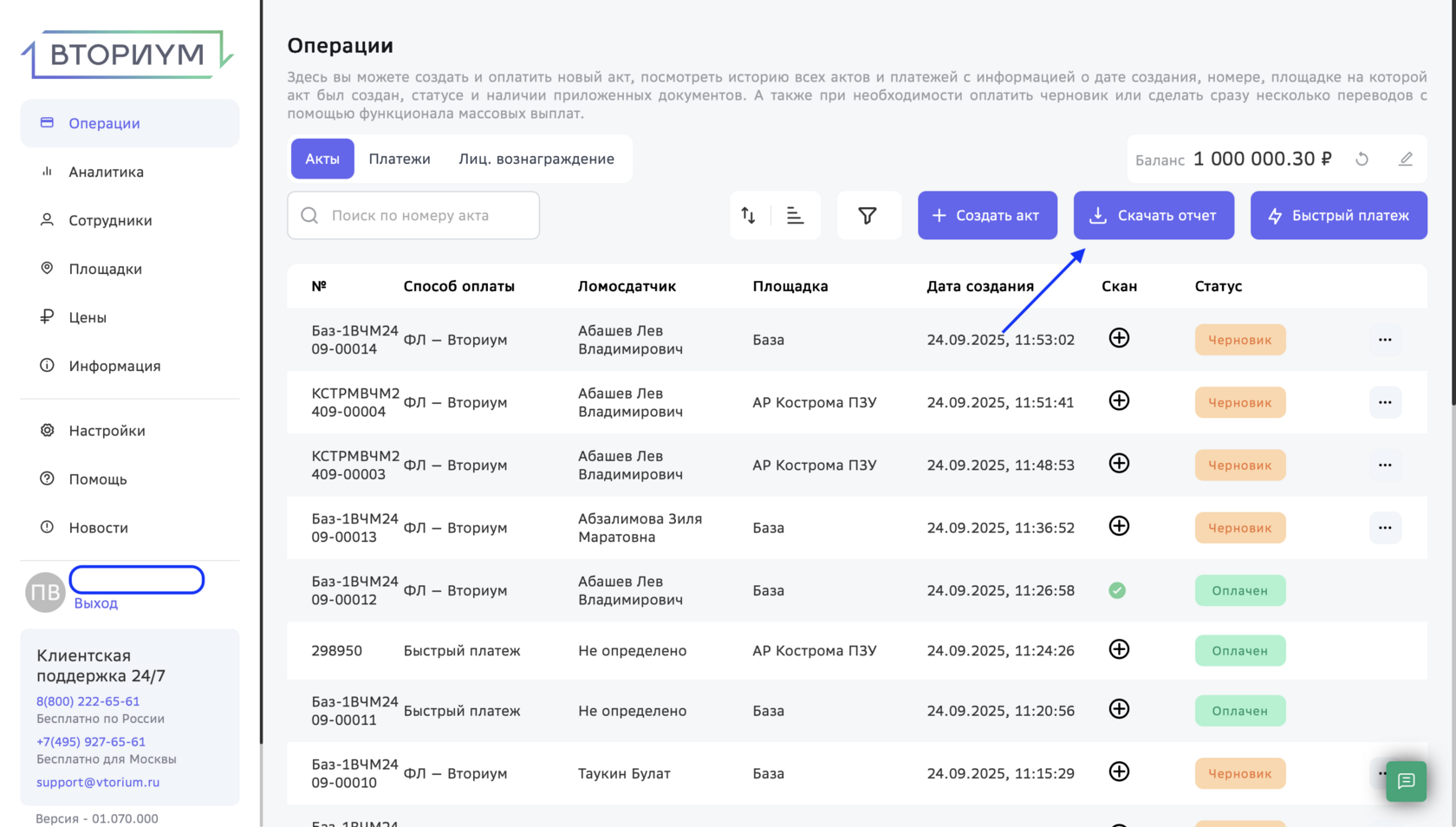Для формирования отдельного отчета войдите в систему под учетной записью администратора и перейдите в раздел «Операции». Затем нажмите «Скачать отчет».