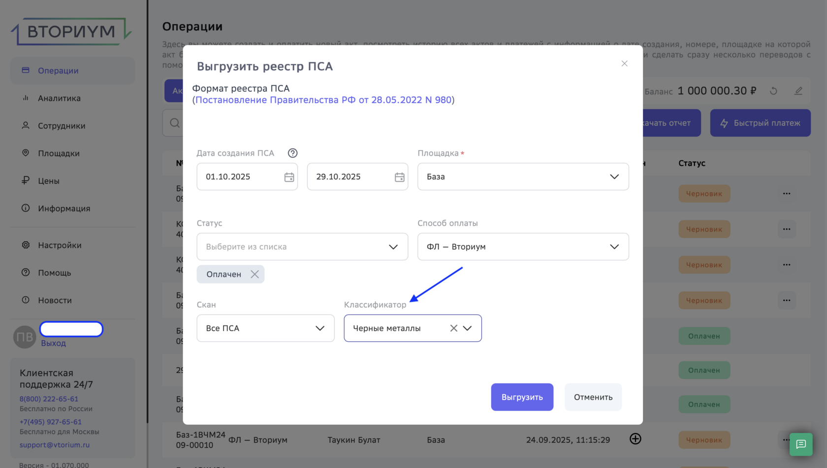 На платформе «Вториум» появилась возможность генерировать реестр ПСА отдельно для черных и цветных металлов.
